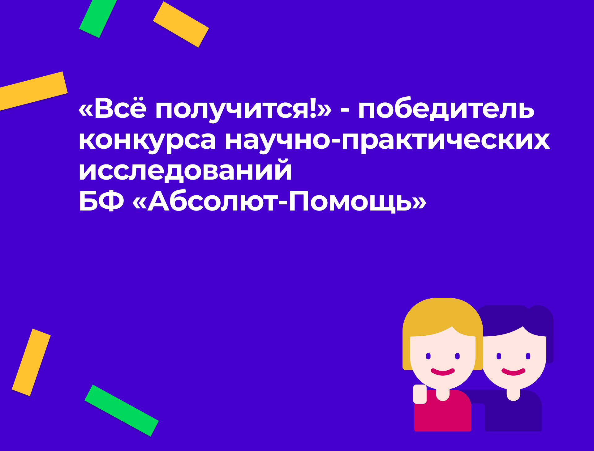 «Всё получится!» стал победителем конкурса научно-практических исследований социального развития в сфере помощи детям и молодым взрослым в ситуации уязвимости 2025 БФ «Абсолют-помощь».